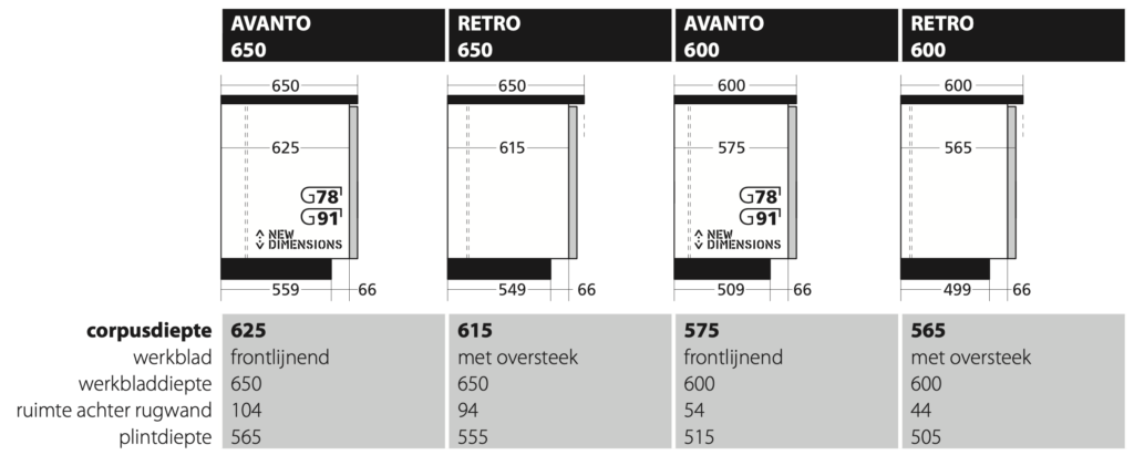in de prijslijst staan de maatvoeringen van de standaard leverbare corpusdieptes Avanto 650, Retro 650, Avanto 600 en Retro 600 en hoe deze zich verhouden tot bladdieptes en hoekopstellingen.