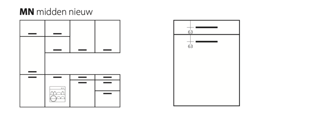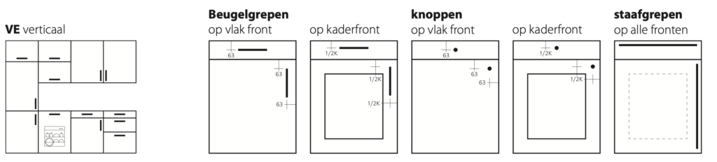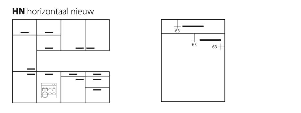 Zelfde optie als HO maar uitsluitend voor vlakke fronten en de greep zit 63mm vanaf de bovenzijde en zijkant geboord