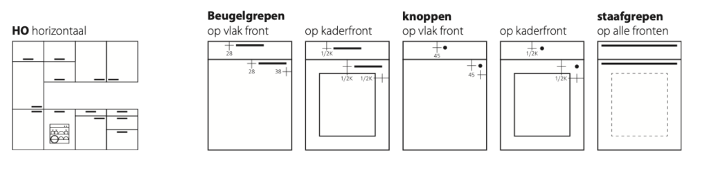 De greepboringen worden veelal in een raster (afstand tussen boorgaatjes) van 32mm aangeboden en per greep worden de hoogte-, lengte- en breedtemaat aangegeven.