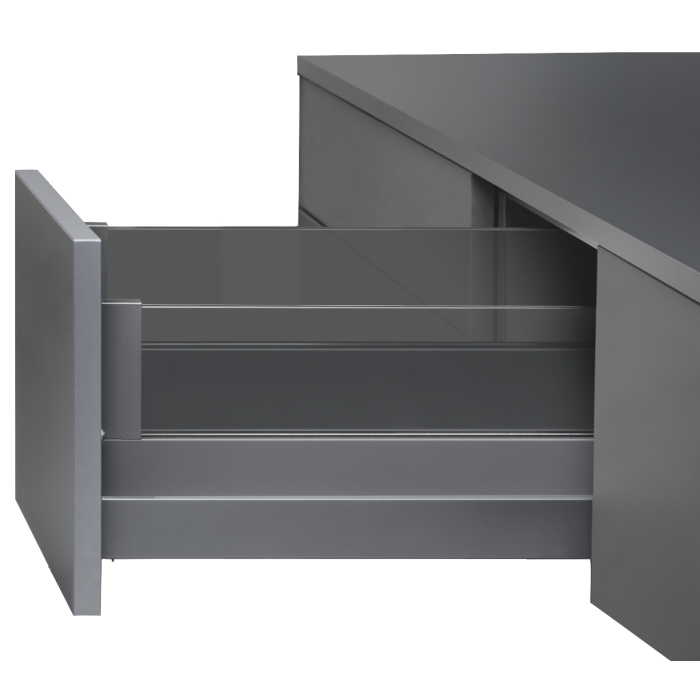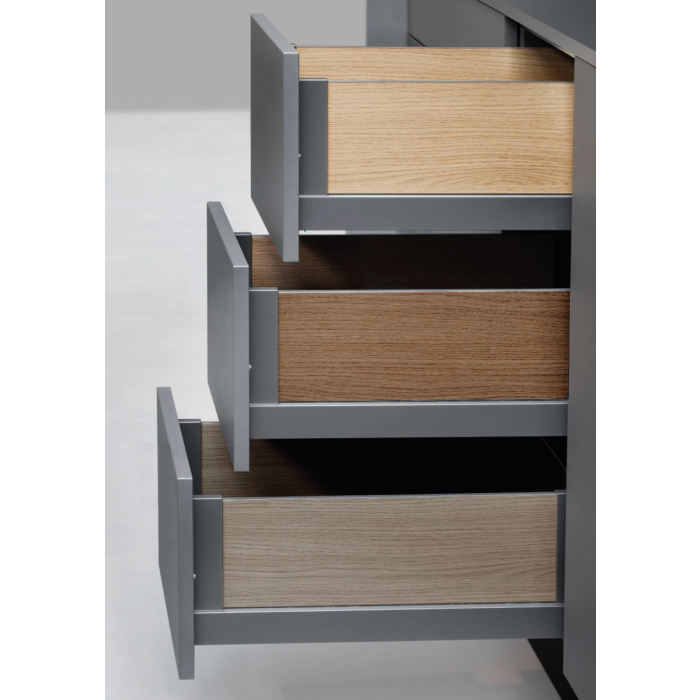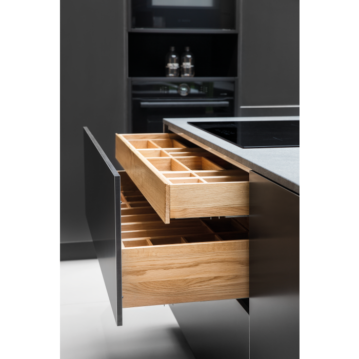 Standaard worden de keukens geleverd met de laden en korven van het type Zircon ZX950 Een Anthraciet kleurige lade waarbij de zijkanten van de korven uit rookglas bestaan met een hoogte van 95 mm. Deze rechte lade met een smalle basis heeft een optimale binnenruimte.